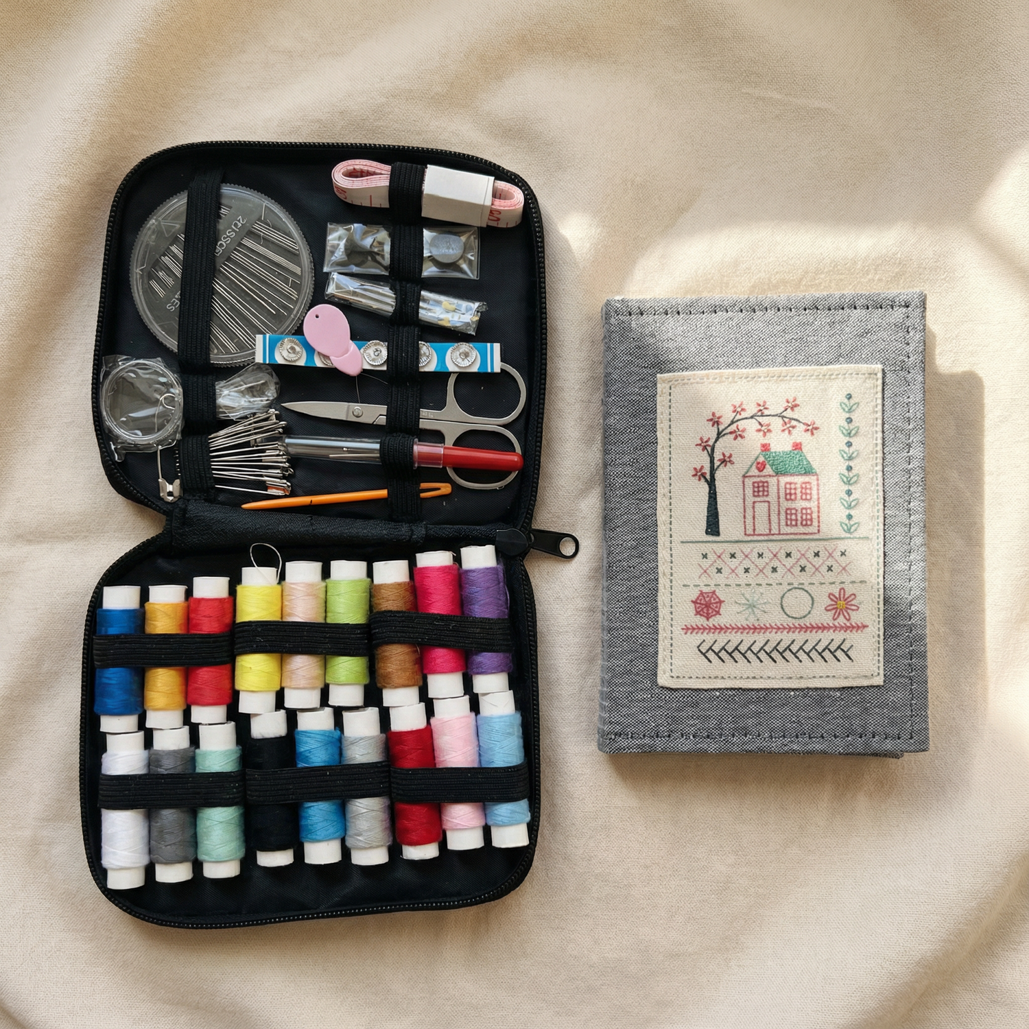 1x livre de broderie en tissu, 1x aiguille, 1x enfile-aiguille, 1x paire de ciseaux de broderie, et un set complet de fils colorés.